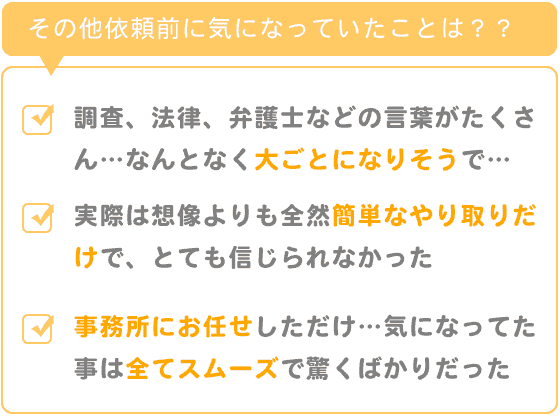 たくさんの書類等取寄せないといけないと思ってましたが何も取寄せる事もなく事務所の方におまかせしただけで、気になってた事は全てスムーズにうまくしてもらっておどろくばかりでした。
