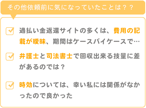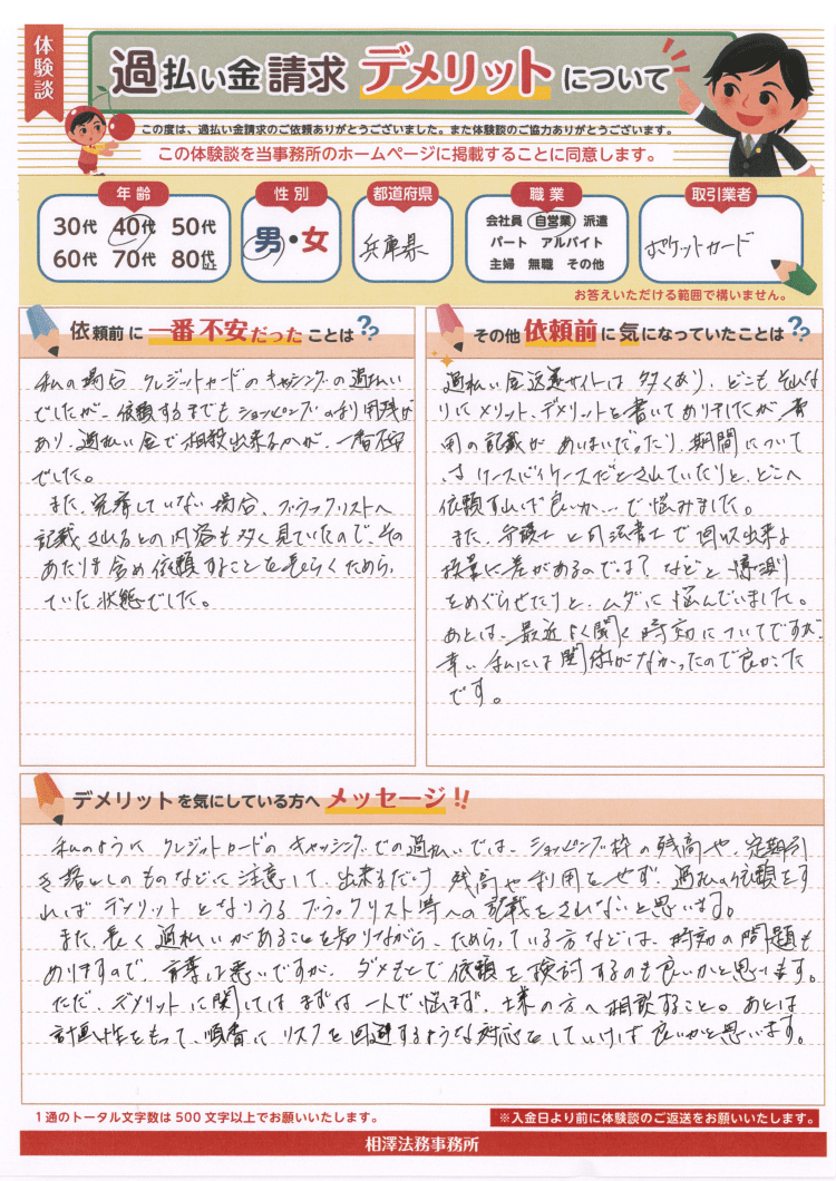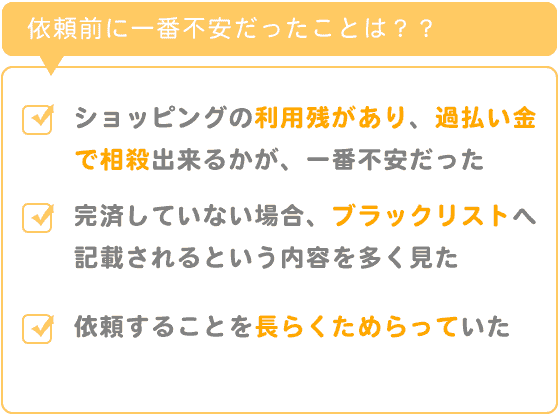 私の場合、クレジットカードのキャッシングの過払いでしたが、依頼するまでもショッピングの利用残があり、過払い金で相殺出来るかが、一番不安でした。