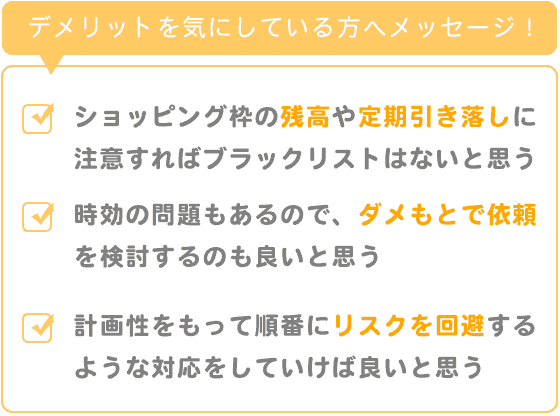 私のようにクレジットカードのキャッシングでの過払いでは、ショッピング枠の残高や、定期引き落しのものなどに注意して、出来るだけ残高や利用をせず、過払の依頼をすればデメリットとなりうるブラックリスト等への記載をされないと思います。
