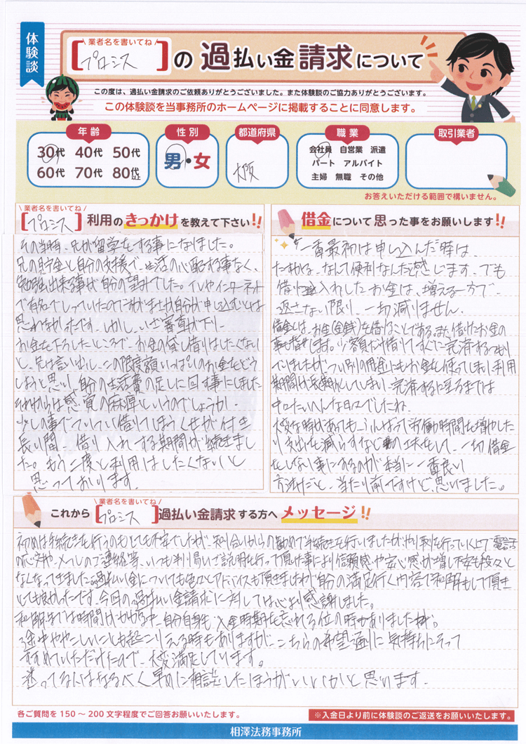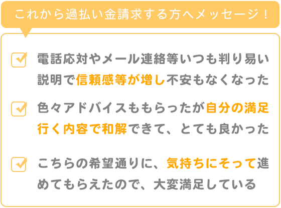 初めは手続きを行うのもとても不安でしたが、知り合いからの勧めで手続きを行いましたが、やり取りを行っていく上で電話の応対や、メールのご連絡等、いつも判り易いご説明を行って頂けた事により信頼感や安心感が増し不安も段々となくなってきました。過払い金についても色々とアドバイスも頂きましたが自分の満足行く内容で和解もして頂きとても良かったです。今回の過払い金請求に対しては心より感謝しました。