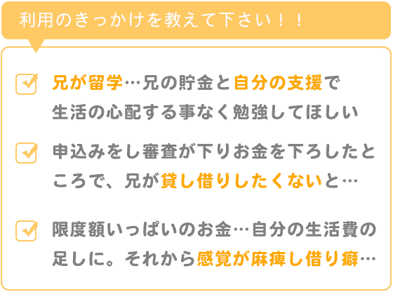 しかし、いざ審査が下り、お金を下ろしたところで、お金の貸し借りはしたくないと、兄は言い出し、この限度額いっぱいのお金をどうしようと思い、自分の生活費の足しに回す事にしました。それからは感覚の麻痺というのでしょうか。少しの事でついつい借りてしまうくせが付き、長い間、借り入れする期間が続きました。