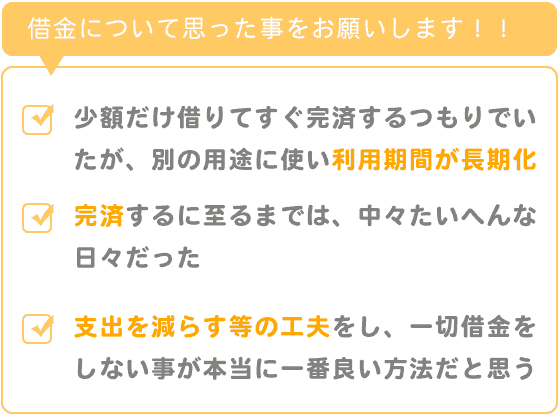 大変な時があってもふんばって労働時間を増やしたり支出を減らすなどの工夫をして、一切借金をしない事にするのが本当に一番良い方法だと、当たり前ですけど思いました。