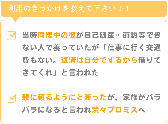当時一緒に住んでいた彼が自己破産し、その後も節約等できる人ではなく、養っていましたが「お金が足りない。ケータイも払えないし、仕事に行く交通費もない。返済は自分でするから借りてきてくれ」と言われました。