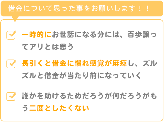 しかし、すぐに返済できず長引いてくると、借金の存在に慣れ、感覚が麻痺し、どんどんと抵抗がなくなってズルズルと借金があって当たり前の生活になっていくのが本当に怖いです。