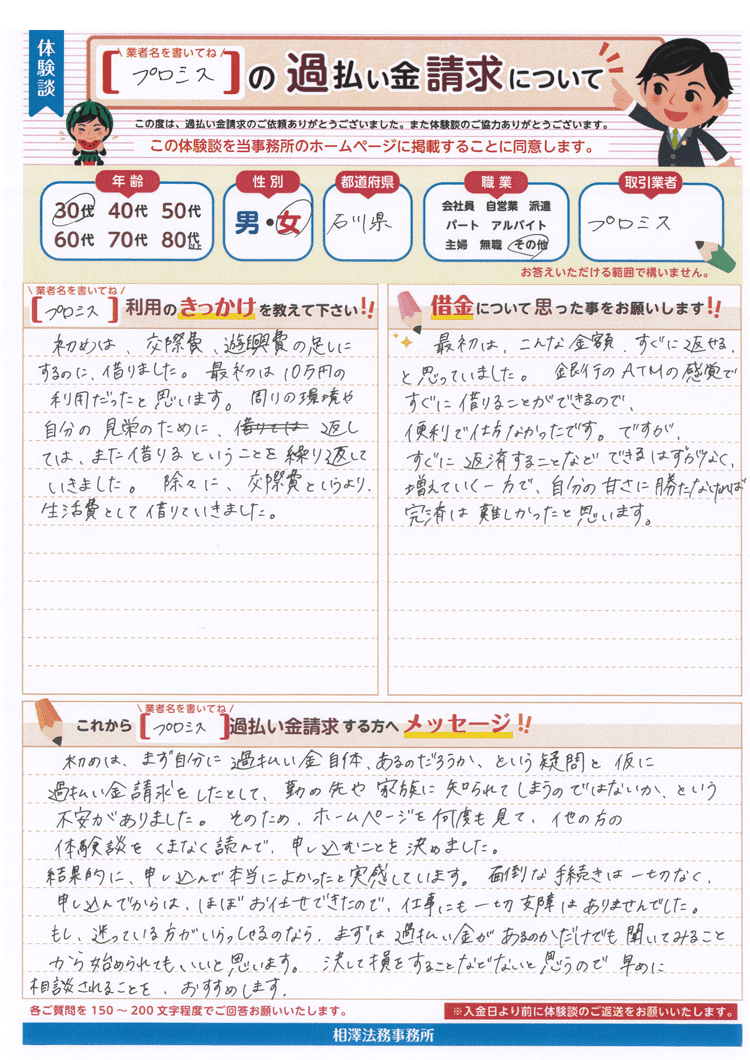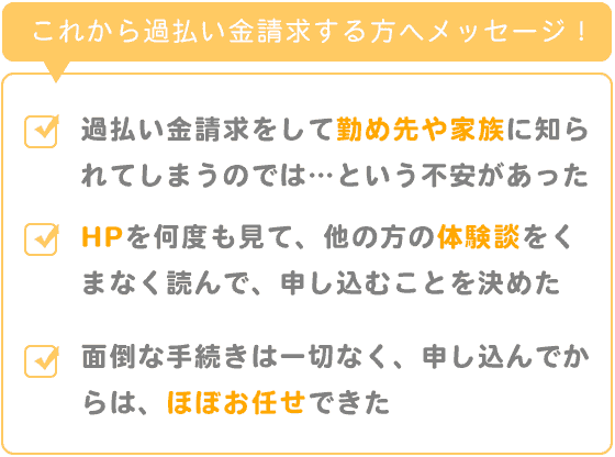 初めは、まず自分に過払い金自体、あるのだろうか、という疑問と仮に過払い金請求をしたとして、勤め先や家族に知られてしまうのではないか、という不安がありました。