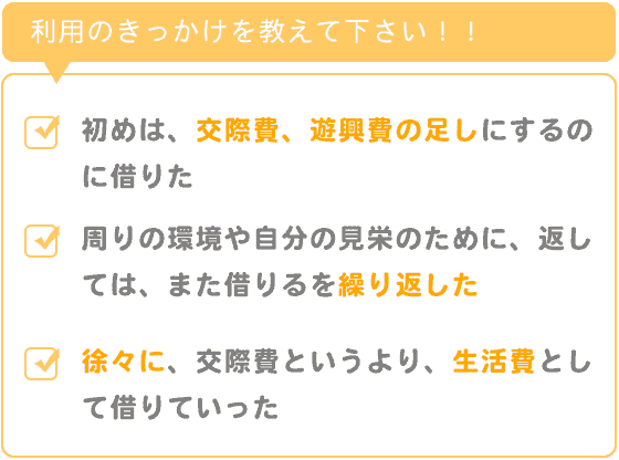 初めは、交際費、遊興費の足しにするのに、借りました。