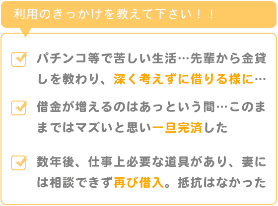 若い頃はパチンコやお酒でお金を使い苦しい生活でした、そんな時、仕事の先輩から、金貸しがあると教えてもらい、深く考える事なく、借りる様になりました。