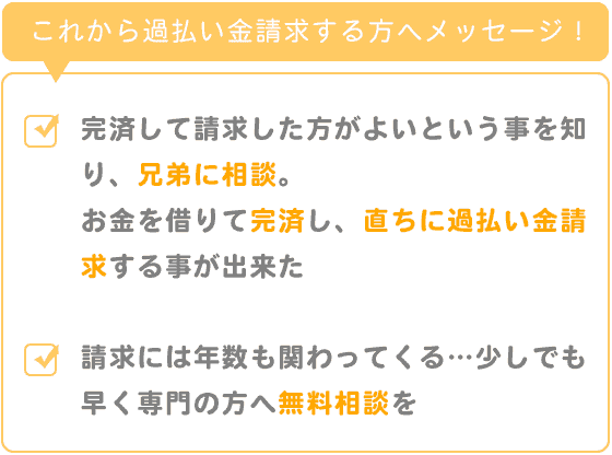 過払い金を請求しようと思い、一度諦めた時の事ですが、先ず、完済して請求した方がよいという事を知り、兄弟に相談をしお金を借りて完済し直ちに過払い金請求する事が出来ました。