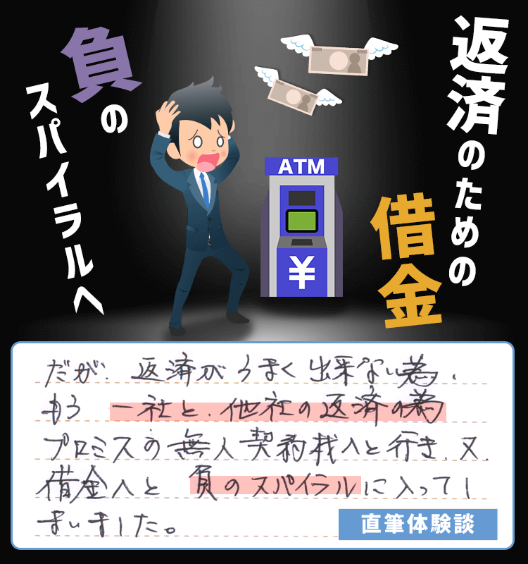 だが、返済がうまく出来ない為、もう一社と、他社の返済の為プロミスの無人契約機へと行き、又、借金へと負のスパイラルに入ってしまいました。