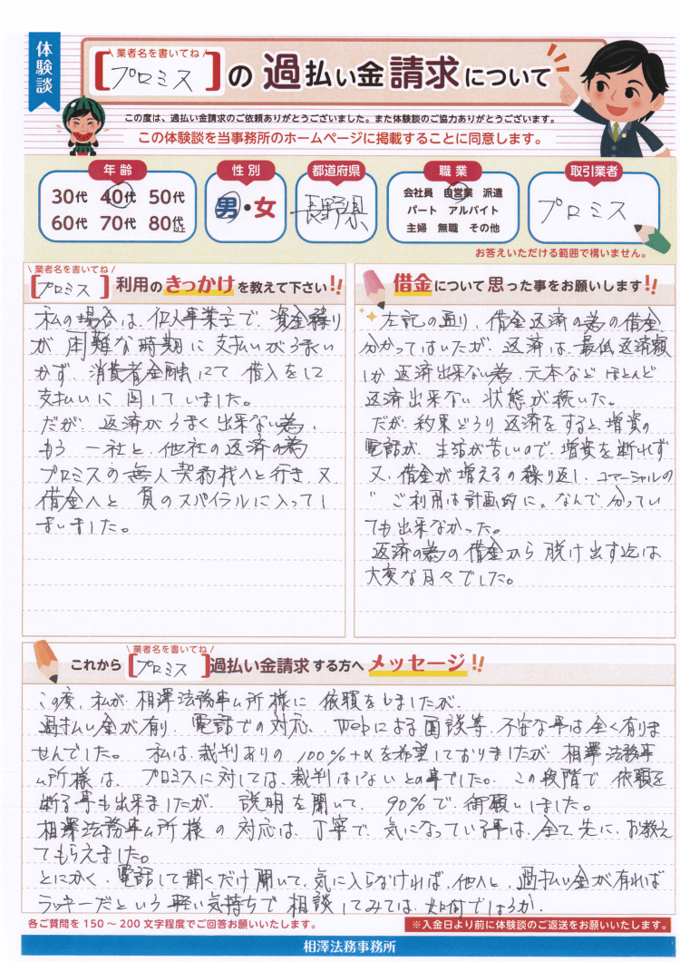 私は、裁判ありの100%+αを希望しておりましたが、相澤法務事ム所様は、プロミスに対しては、裁判はしないとの事でした。