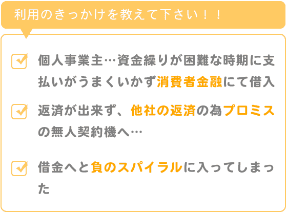 私の場合は、個人事業主で、資金繰りが困難な時期に支払いがうまくいかず、消費者金融にて借入をして支払いに用していました。