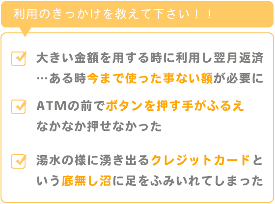 それでも翌月には返せていたので大丈夫と思っていたのですがある時今まで使ったことのない金額が必要になりATMの前でボタンを押す手がふるえなかなか押せませんでしたが、意を決し押し金額が出てきた時ホッとしたのを憶えています。