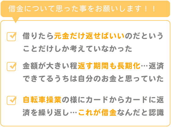 金額が大きい程返す期間も長くなり返済できてるうちは自分のお金と思っていましたが自転車操業のようにカードからカードに返済を繰り返すうちにこれが借金なんだという認識にかわりました。
