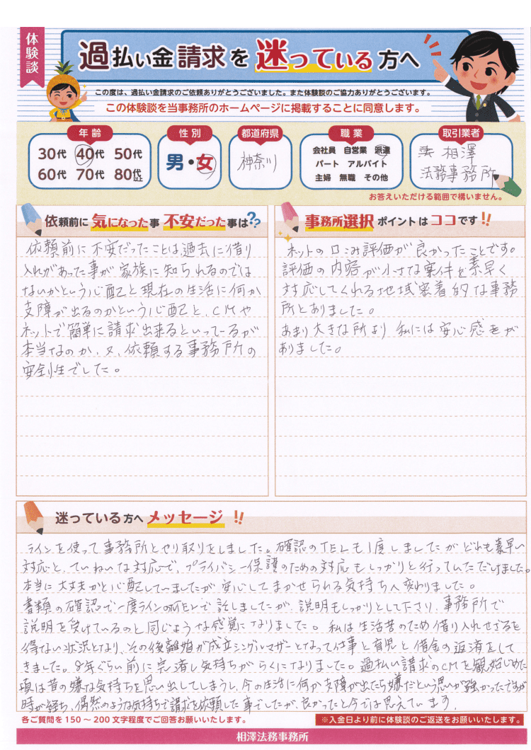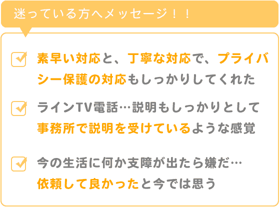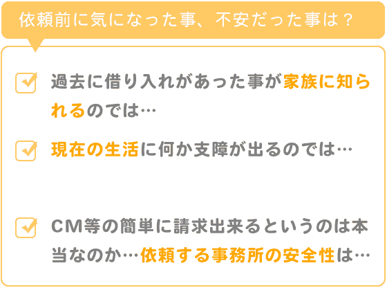 依頼前に不安だったことは、過去に借り入れがあった事が家族に知られるのではないかという心配と現在の生活に何か支障が出るのかという心配と、CMやネットで簡単に請求出来るといっているが本当なのか、又、依頼する事務所の安全性でした。