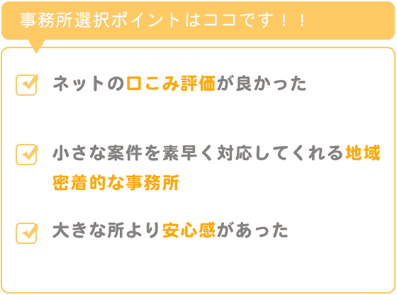 評価の内容が小さな案件を素早く対応してくれる地域密着的な事務所となりました。