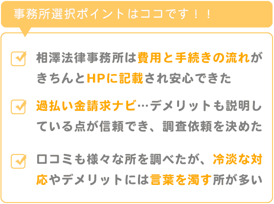 過払い金請求ナビもとても分かりやすく、請求時においてのデメリットもきちんと説明している点が信頼でき、調査を依頼することにしました。