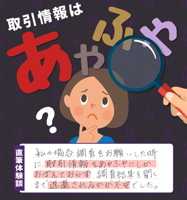 私の場合、調査をお願いした時に、取引情報をあやふやにしかおぼえておらず、調査結果を聞くまで返還されるかが不安でした。