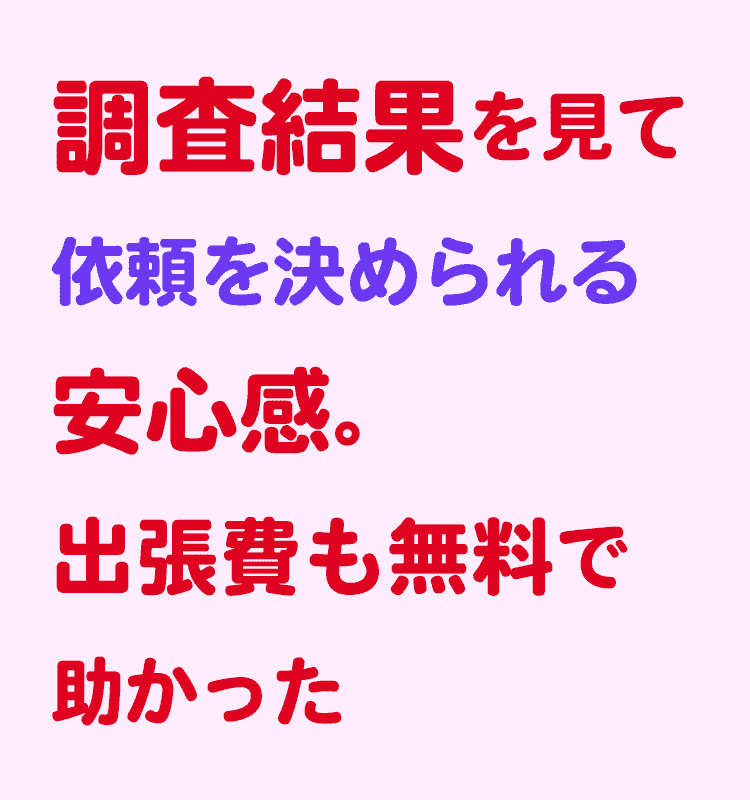 HPや実際に頂いた、調査結果を見て、依頼する事に決めましたが、地元にある会社ではなく、何かあった時はどうなるのだろうと不安もありましたが、HPに会社代表者のプロフィールも載っており、安心感につながりました。
