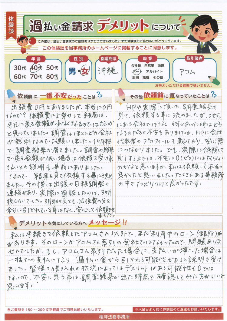 そのローンがアコムさん系列の会社ではなかったので、問題ありませんでしたが、もしアコムさん系列だった場合に、支払いが滞こった場合は一括での支払いになり、過払い金から引かれる可能性があると説明を受けました。