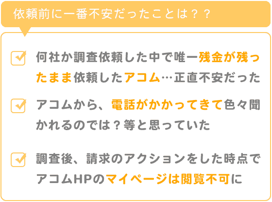 今回何社か過払い金について調査して頂いた中で唯一残金が残っていたまま依頼したのが、こちらのアコムだったので、正直不安しかありませんでした。