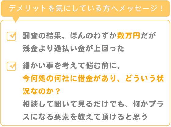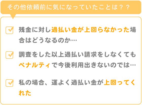 やはり残金に対し過払い金が上回らなかった場合、調査をしてしまった以上、過払い請求を実行しなかったとしてもペナルティーとなり今後利用出きないのではないか?と言う不安はありました。
