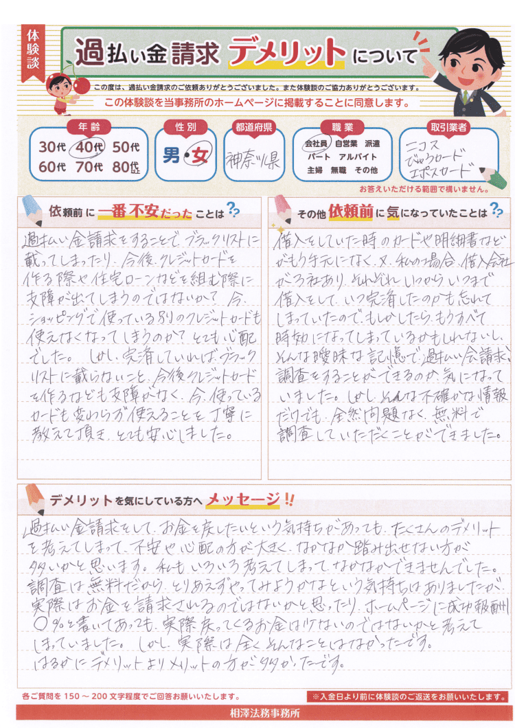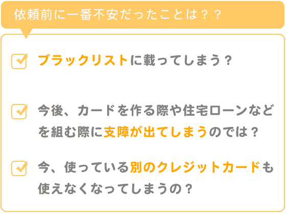 過払い金請求をすることで、ブラックリストに載ってしまったり、今後、クレジットカードを作る際や住宅ローンなどを組む際に支障が出てしまうのではないか?今、ショッピングで使っている別のクレジットカードも使えなくなってしまうのか?とても心配でした。