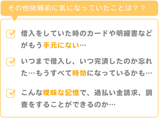借入をしていた時のカードや明細書などがもう手元になく、又、私の場合、借入会社が3社あり、それぞれいつからいつまで借入をして、いつ完済したのかも忘れてしまっていたので、もしかしたら、もうすべて時効になってしまっているかもしれないし、そんな曖昧な記憶で、過払い金請求、調査をすることができるのか、気になっていました。