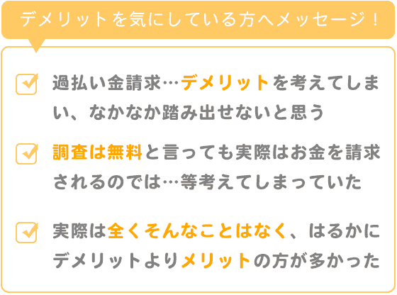 調査は無料だから、とりあえずやってみようかなという気持ちはありましたが、実際はお金を請求されるのではないかと思ったり、ホームページに成功報酬〇%と書いてあっても、実際戻ってくるお金は少ないのではないかと考えてしまっていました。