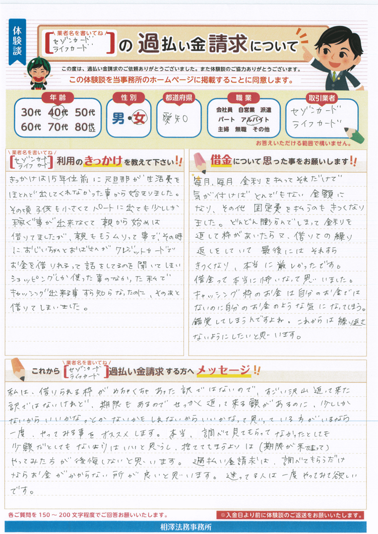 どんどん膨らんでしまって金利を返して枠があいたら又、借りての繰り返しをしていて最後にはそれすらきつくなり、本当に厳しかったです。