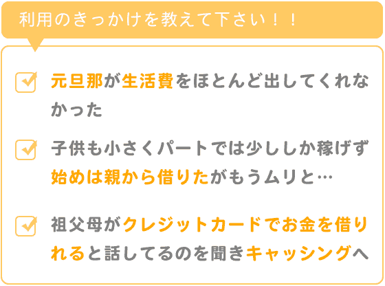 その頃子供も小さくてパートに出ても少ししか稼ぐ事が出来なくて親から始めは借りてましたが、親はもうムリって事で、その時におじいちゃんとおばあちゃんがクレジットカードでお金を借りれるって話をしてるのを聞いてしまいショッピングしか使った事のなかった私でキャッシング出来る事すら知らなかったのに、そのあと借りてしまいました。