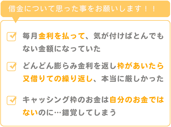 借金って本当に怖いなって思いました。キャッシング枠のお金は自分のお金ではないのに自分のお金のような気になってしまう錯覚してしまうんですよね。これからは繰り返さないようにしたいと思います。
