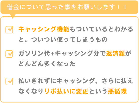 ガソリン代+キャッシング分で返済額がどんどん多くなる。払いきれずにまたキャッシングで借りる。