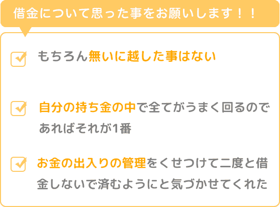 お金を借りないで生活ができるように仕事や普段のお金づかい、お金の出入りの管理をくせつけて二度と借金しないで済むようにしたいと気づかせてくれたのはいい面だったかもしれません。