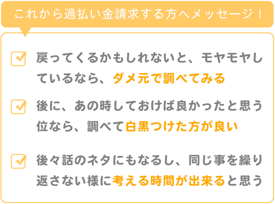 現在の生活が現時点で、うまく事が進んでいないから、過払い金請求をしようと考えているので、今後、自分がどの様な生活を送りたいか、又は戻ってくるかもしれないと、今モヤモヤしているならば、ダメ元で聞いて調べてみる事をすすめます。
