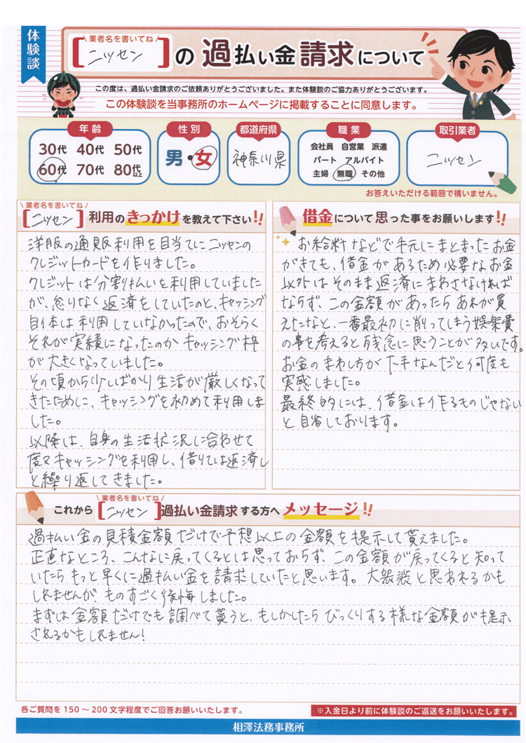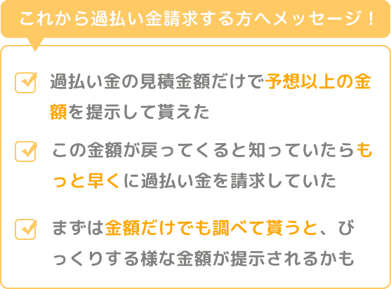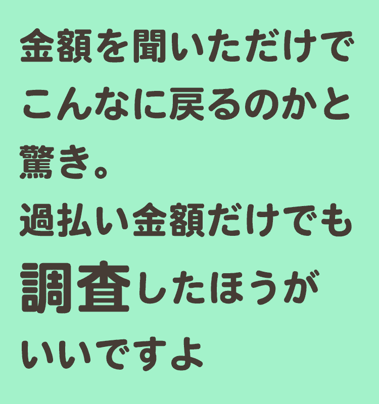 正直なところ、こんなに戻ってくるとは思っておらず、この金額が戻ってくると知っていたらもっと早くに過払い金を請求していたと思います。
