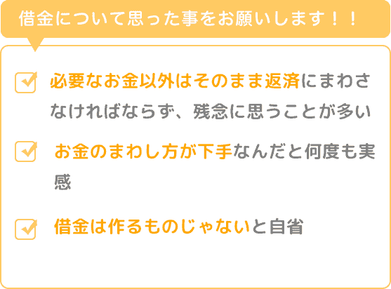お給料などで手元にまとまったお金がきても、借金があるため必要なお金以外はそのまま返済にまわさなければならず、この金額があったらあれが買えたなと、一番最初に削ってしまう娯楽費の事を考えると残念に思うことが多いです。