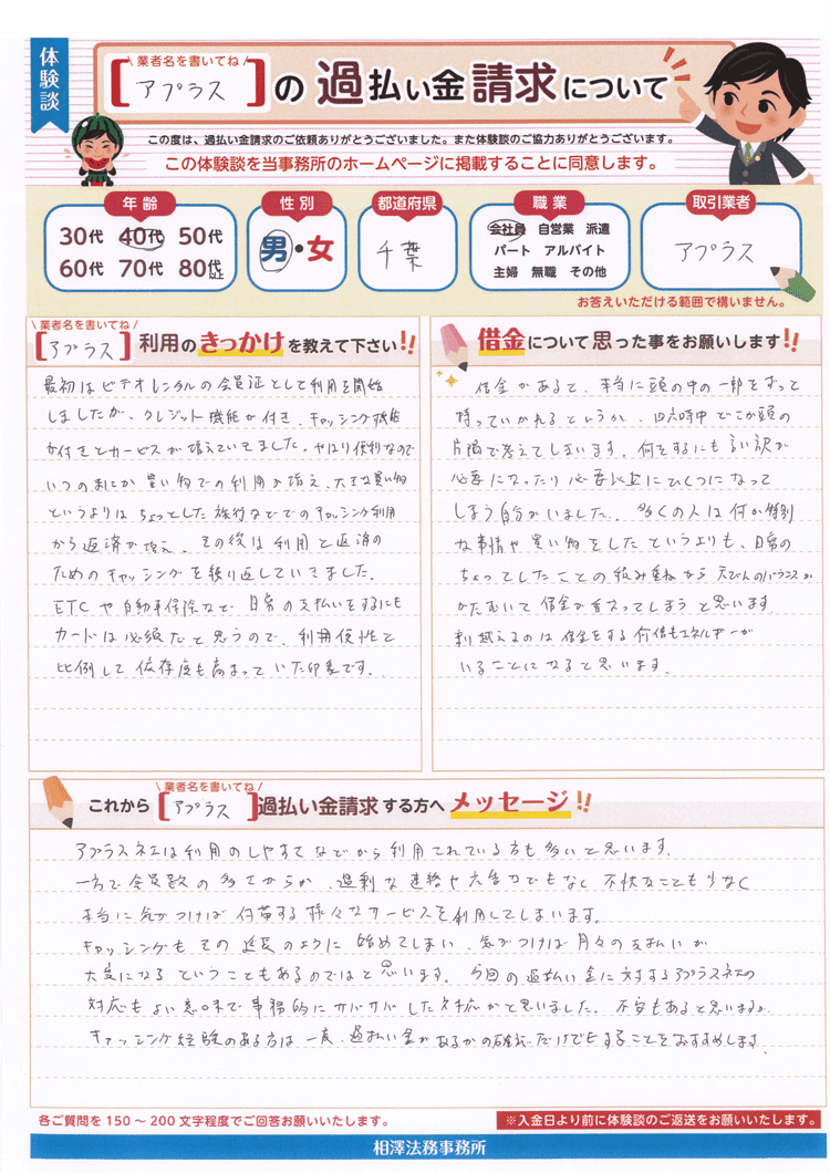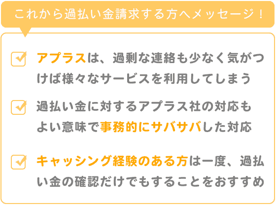 今回の過払い金に対するアプラス社の対応もよい意味で事務的にサバサバした対応かと思いました。