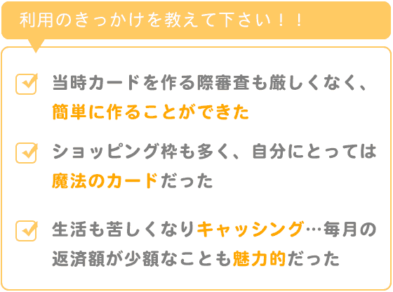 20代のころ、当時あまりお金をもっていなくてほしい商品が買えなくてクレジットカードだと簡単に商品が購入できるのと、近くのショッピングモールで簡単にカードを作ることを知りその当時カードを作る際審査も厳しくなく、簡単に作ることができた。