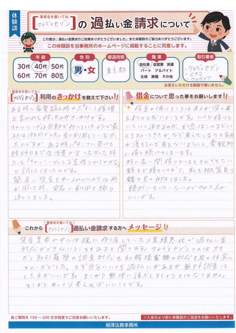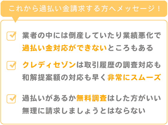 クレディセゾンさんは大手だし取引履歴の調査対応も和解提案額の対応も早く非常にスムーズでした。