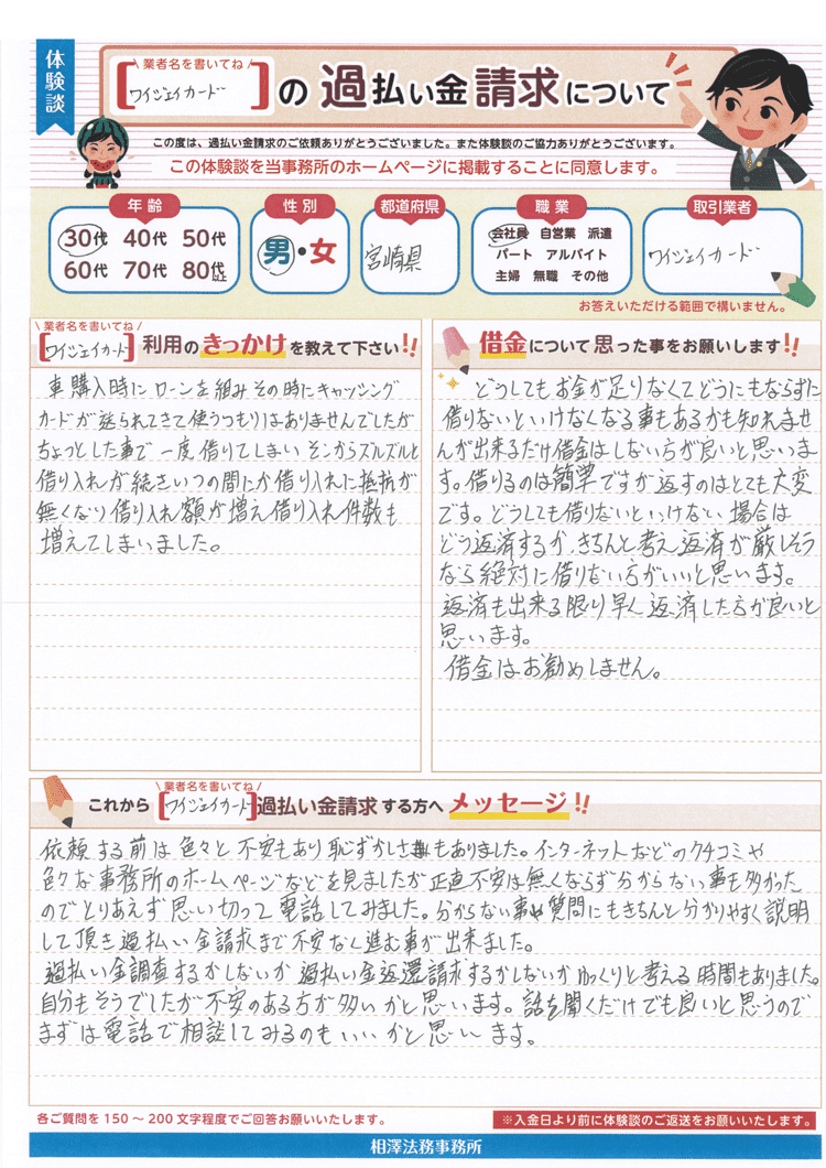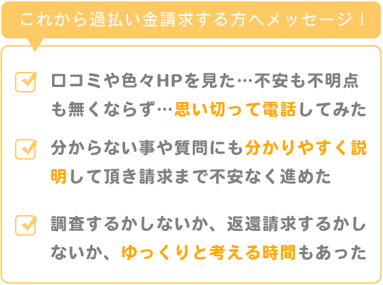 分からない事や質問にもきちんと分かりやすく説明して頂き過払い金請求まで不安なく進む事が出来ました。