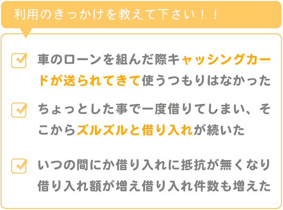 車購入時にローンを組みその時にキャッシングカードが送られてきて使うつもりはありませんでしたがちょっとした事で一度借りてしまいそこからズルズルと借り入れが続きいつの間にか借り入れに抵抗が無くなり借り入れ額が増え借り入れ件数も増えてしまいました。