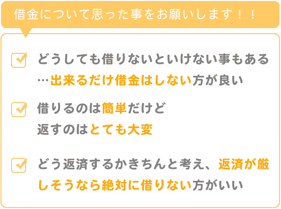 どうしてもお金が足りなくてどうにもならずに借りないといけなくなる事もあるかも知れませんが出来るだけ借金はしない方が良いと思います。
