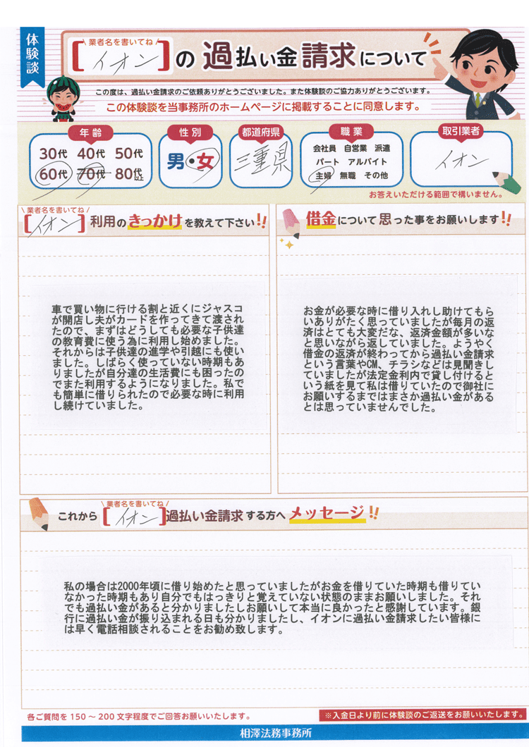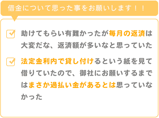 ようやく借金の返済が終ってから過払い金請求という言葉やCM、チラシなどは見聞きしていましたが法定金利内で貸し付けるという紙を見て私は借りていたので御社にお願いするまではまさか過払い金があるとは思っていませんでした。