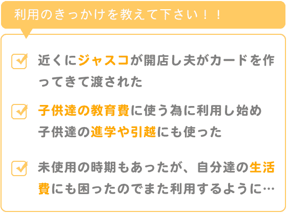 車で買い物に行ける割と近くにジャスコが開店し夫がカードを作ってきて渡されたので、まずはどうしても必要な子供達の教育費に使う為に利用し始めました。