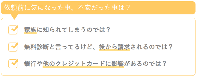 また、無料診断と言ってるけど、実はあとから請求されるのではとか、過払い金がなかったら恥ずかしいとか、過払い請求したことで銀行や他のクレジットカードに影響があるのかと不安でした。
