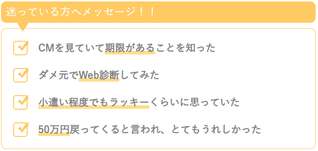 私はお小遣い程度でも戻ってくるとラッキーかなくらいに思っていましたが、50万円戻ってくると言われ、とてもうれしかったです。