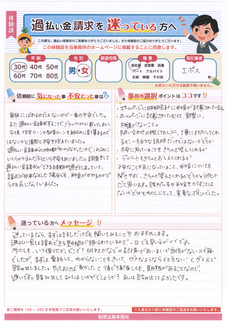 過払い金請求の相場がわからなかったので、はじめにいくらかかるんだろうという不安もありました。