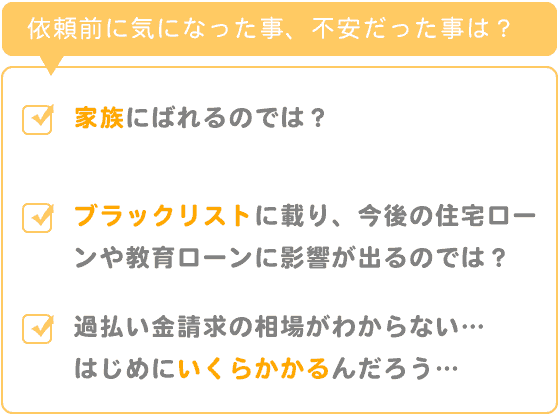 また、過払い金請求することで、ブラックリストに載ってしまい、今後、住宅ローンや教育ローンを組むのに影響するのではないかと漠然と不安を抱えていました。