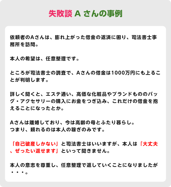 上記の失敗例は、「無理をして任意整理を選んだ」ケースでしたが、「気がゆるんで散財し、結局破産する」例もあります。