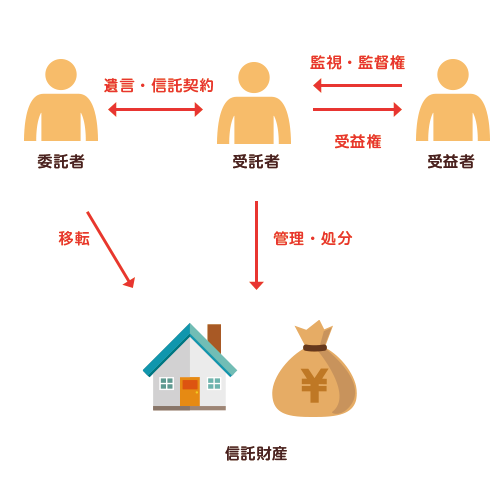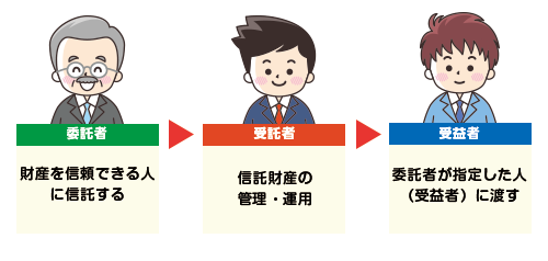 委託者が自らの財産を信頼出来る人(受託者)に信託し、受託者は信託された財産を管理、運用し、そこから生まれた利益を受け取ります。